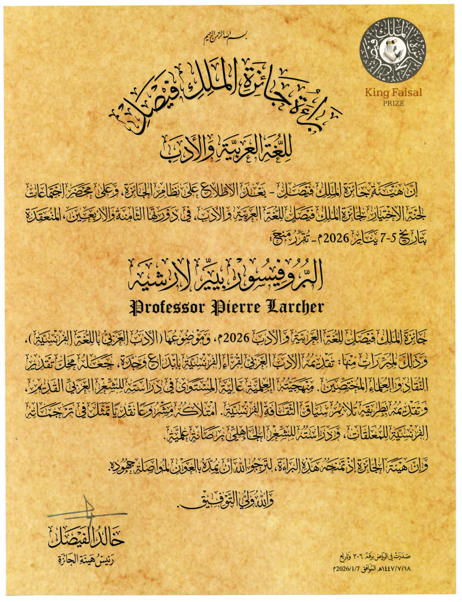 تتضمن قائمة المراجع الخاصة ببيير لارشيه 350 عنصرًا من الكتب والمقالات الفردية والمشتركة والمراجعات. وهو عضو في العديد من الجمعيات العلمية وعضو في هيئة تحرير عشر مجلات علمية فرنسية وأجنبية. كُرّم في عام 2016 عن عمله في مجال اللغويات العربية، وفي عامَي 2008 و2014 عن عمله في مجال الترجمة. وهو عضو في أكاديميا أمبروسيانا (Classis Orientalis) في ميلانو (إيطاليا) منذ عام 2015.